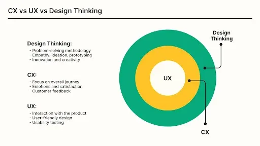 The image depicts the relationship between Customer Experience, User Experience, and Design Thinking using concentric circles. Design Thinking, represented by the outer green circle, is described as a problem-solving methodology involving empathy, ideation, and prototyping for innovation and creativity. The middle yellow circle represents UX, focusing on interaction with the product, user-friendly design, and usability testing. The innermost circle labeled "UX" represents the core of UX. CX is shown as the central point, emphasizing its focus on the overall customer journey, emotions, satisfaction, and feedback.