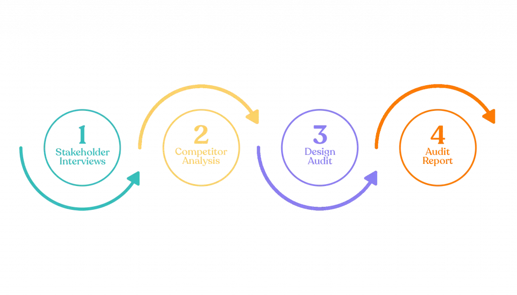 A circular flowchart depicting a design audit process. The process starts with stakeholder interviews, moves to competitor analysis, then to design review, and finishes with an audit report. Arrows flow throughout the circle connecting each step. Text boxes within the circles contain the words "Stakeholder Interviews", "Competitor Analysis", "Design Review", and "Audit Report"