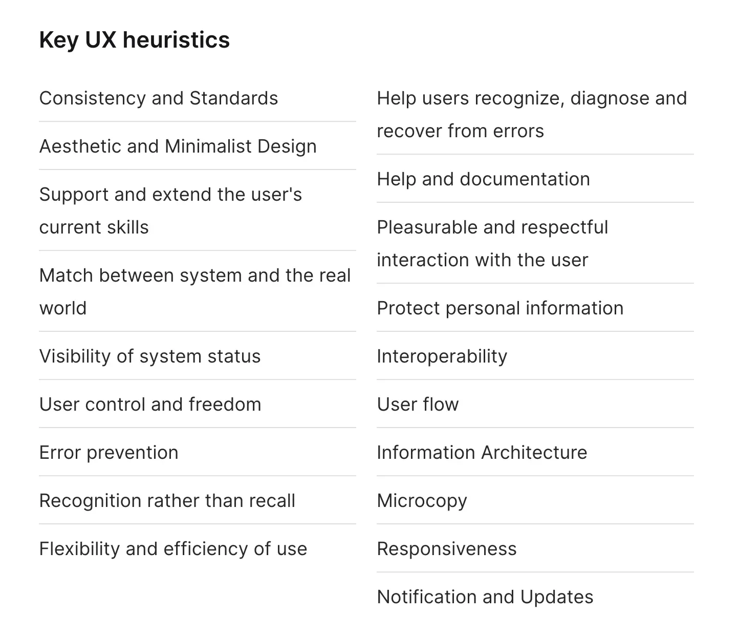 A list of ten key UX heuristics: consistency and standards, aesthetic and minimalist design, support and extend the user's current skills, visibility of system status, interoperability, user control and freedom, user flow, flexibility and efficiency of use, and responsiveness.