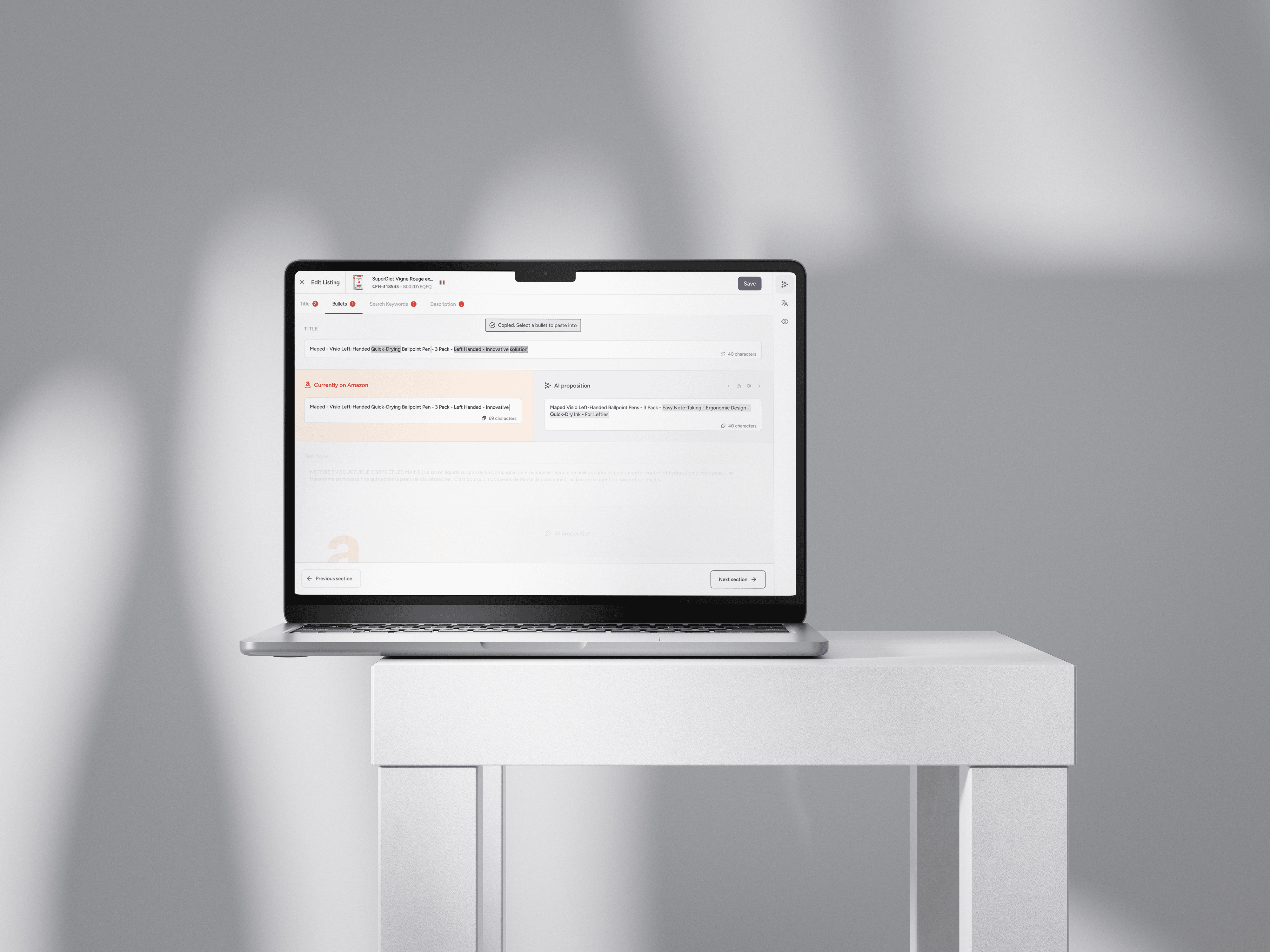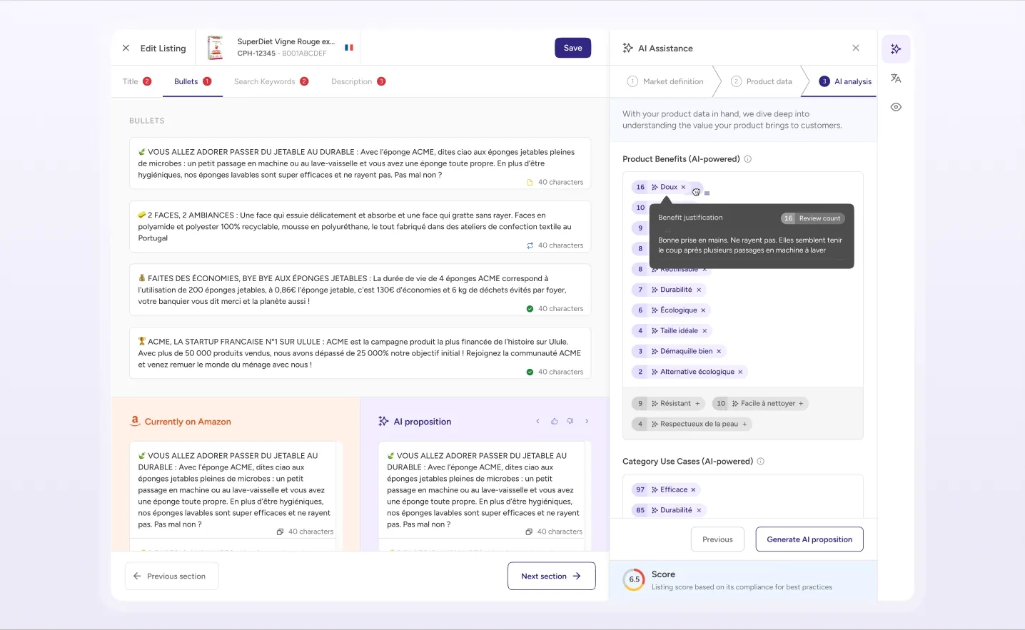 In the initial design for product content management, we prioritized efficiency by pre-populating AI suggestions for product benefits and use cases, requiring minimal user clicks.